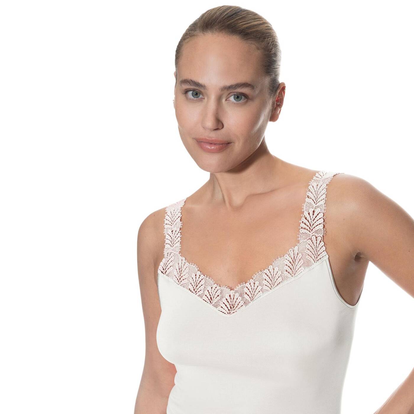 *Schmale Passform*Leichter V-Ausschnitt*Spitzenverzierung am Dekolleté*Gestickte Spitze *Breite Träger, vorne komplett aus Spitze*Runder Rücken*Fließende Qualität