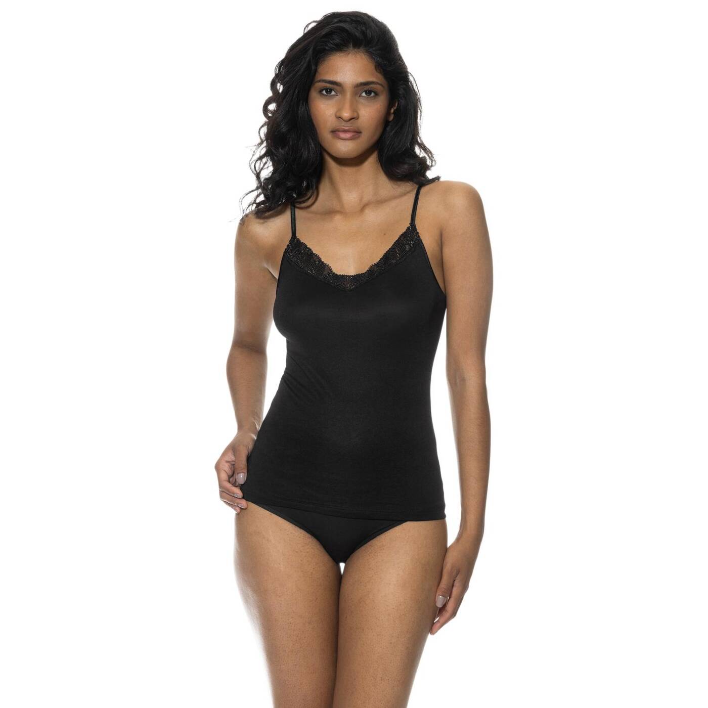 *Schmale Passform*V-Ausschnitt*Spitzenverzierung am Dekolleté*Gestickte Spitze*Feine Spaghetti-Träger, verstellbar*Runder Rücken*Fließende Qualität